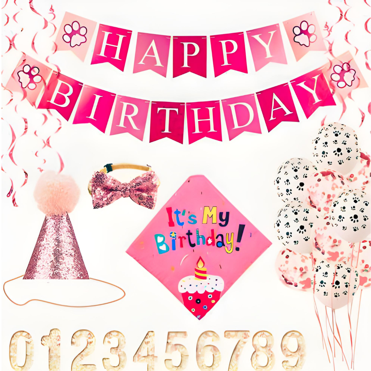 O kit inclui uma bandana, um chapéu festivo com pompom, uma gravata e uma faixa decorativa 'Happy Birthday', 6 bexigas e números de 0 a 9.